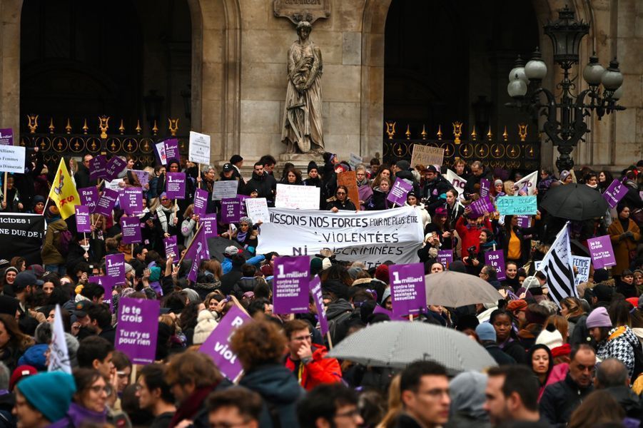 Sous des slogans chocs, des femmes mais aussi des hommes étaient rassemblés à partir de 14 heures devant l'Opéra Garnier. «Ras le viol», «à bas le patriarcat», proclamaient des pancartes, tandis qu'une banderole exigeait la fin des violences : «Pas une de plus». D'autres pancartes portaient simplement le nom et l'âge d'une victime de féminicide, ainsi que son rang dans le macabre décompte que chaque nouveau drame vient allonger. Les manifestantes et manifestants réclament également «un milliard contre les violences».